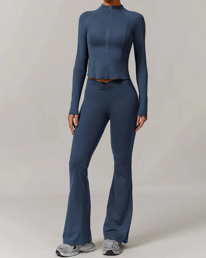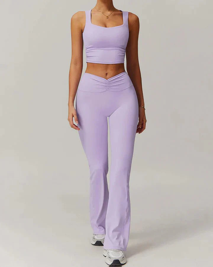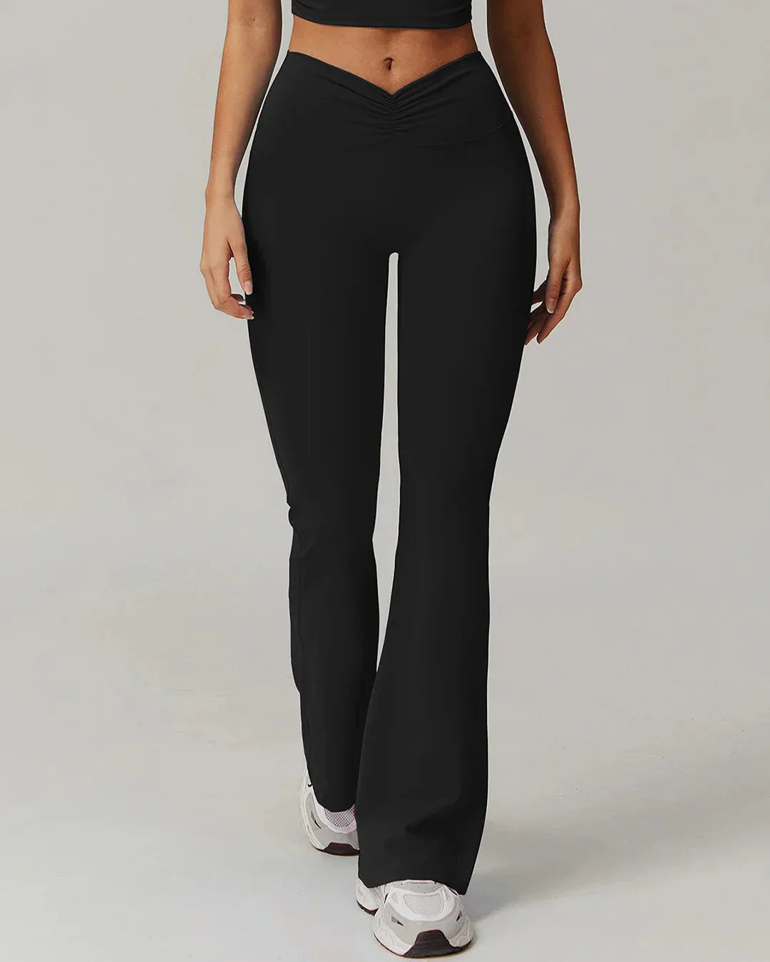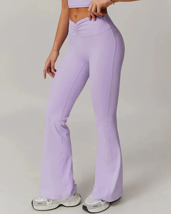Die Amelia Flare Leggings kombinieren hohe Taille, sculpted Passform und eine moderne, ausgestellte Silhouette. Der V-förmige Bund betont die Taille und sitzt während des gesamten Workouts sicher – ohne einzuschneiden. Das Scrunch-Detail auf der Rückseite verstärkt die Form und sorgt für einen schmeichelhaften Look.