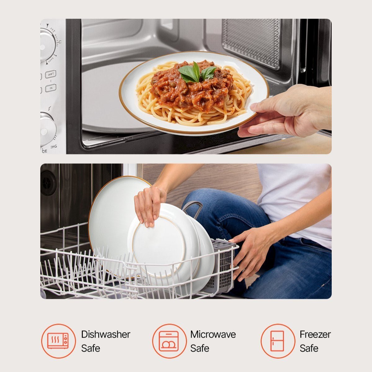 Mit diesem Geschirrset erlebst du nicht nur kulinarische Höhepunkte, sondern auch ein Lebensgefühl, das die Sinne betört. Die hochwertige Keramik sorgt für Langlebigkeit und Widerstandsfähigkeit, während die goldenen Akzente deinem Dinner eine festliche Note verleihen. Jedes Mal, wenn du deine Gäste bewirtest oder ein romantisches Dinner zu zweit genießt, wird dieses Set zum Ausdruck deines exquisiten Geschmacks und deines Sinns für Stil. Lass dich von der Magie der feinen Details verführen und erlebe, wie jedes Mahl zum unvergesslichen Erlebnis wird.
