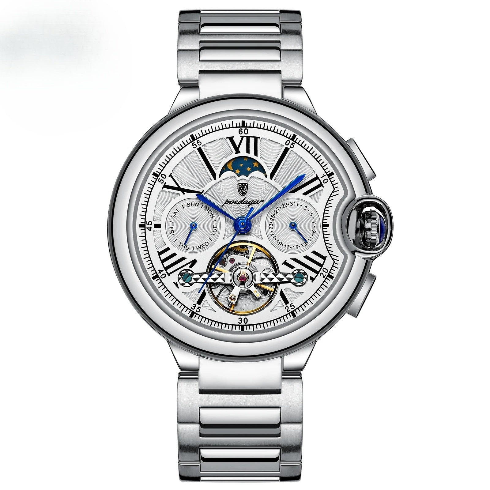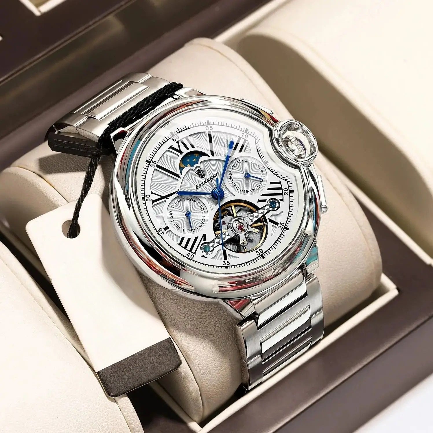 Entdecke den Souveränen Orbiter – ein Meisterwerk der Uhrmacherkunst, das zeitlose Eleganz und höchste Präzision vereint. Dieses exklusive Zeitmesser ist nicht nur ein Accessoire, sondern ein Ausdruck Deines Lebensstils und Deines Sinns für das Besondere. Mit seinem exquisiten Zifferblatt, das in sanften, harmonischen Tönen erstrahlt, und dem luxuriösen Gehäuse aus feinstem Edelstahl, wird der Souveräne Orbiter zum strahlenden Mittelpunkt Deines Auftritts.